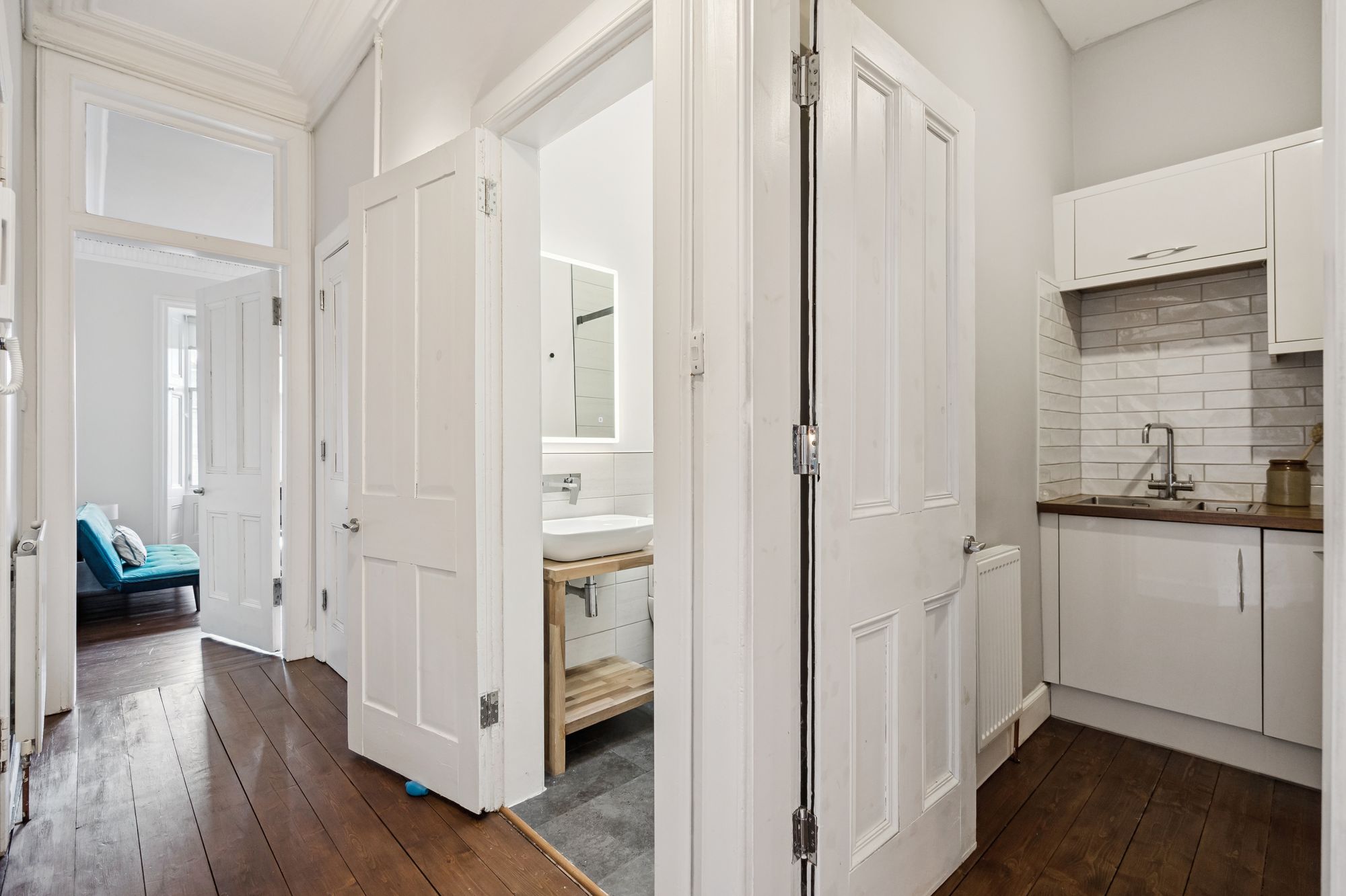 There are two well-proportioned double bedrooms, both peacefully positioned to the rear of the property overlooking the shared garden. The stylish contemporary shower room completes the accommodation, featuring a walk-in shower with rainfall head and body jets, wash hand basin, WC, heated towel rail, and LED mirror.