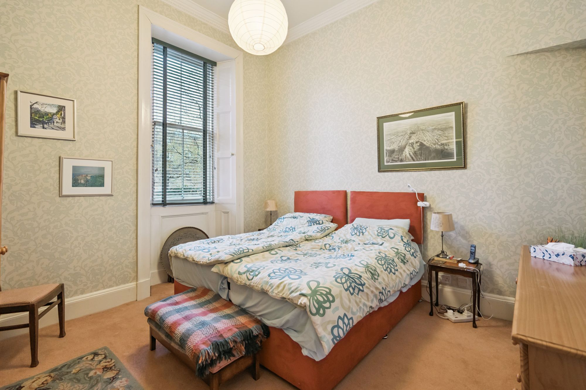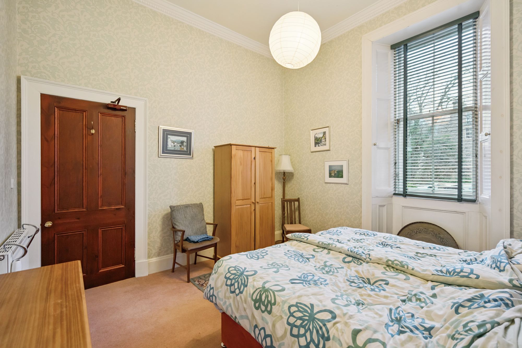 The principal bedroom is equally impressive - light, airy, and well-proportioned, with space for a double bed and additional furnishings. Original cornicing and a large window enhance its peaceful and elegant atmosphere.