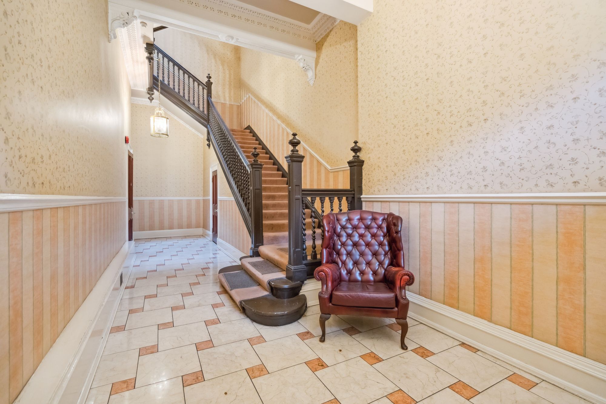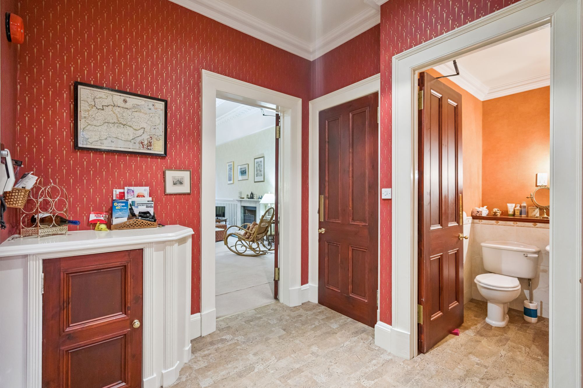Accessed through a secure entry system, the traditional stone-built tenement opens into an impressive shared hallway. With its soaring ceilings and classic décor, the entrance sets a welcoming tone and hints at the character found throughout the home.