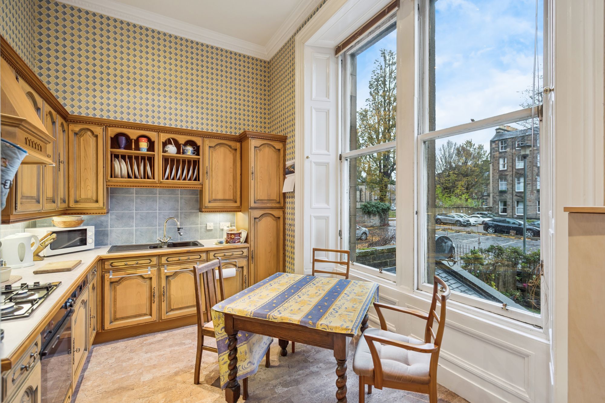 The kitchen continues the home’s timeless feel with traditional cabinetry and high ceilings, creating a bright and inviting space for cooking and dining. Large sash-and-case windows frame leafy views to the rear, adding to the sense of calm.