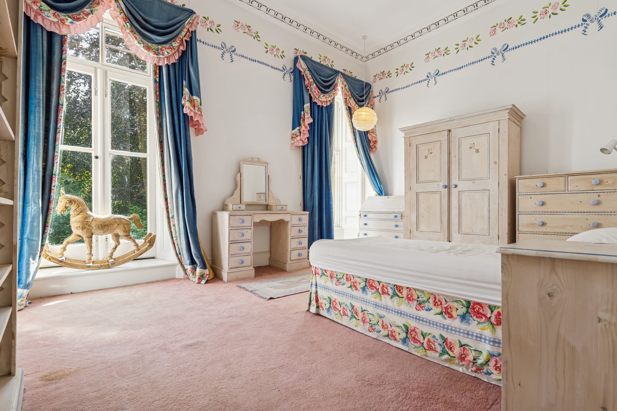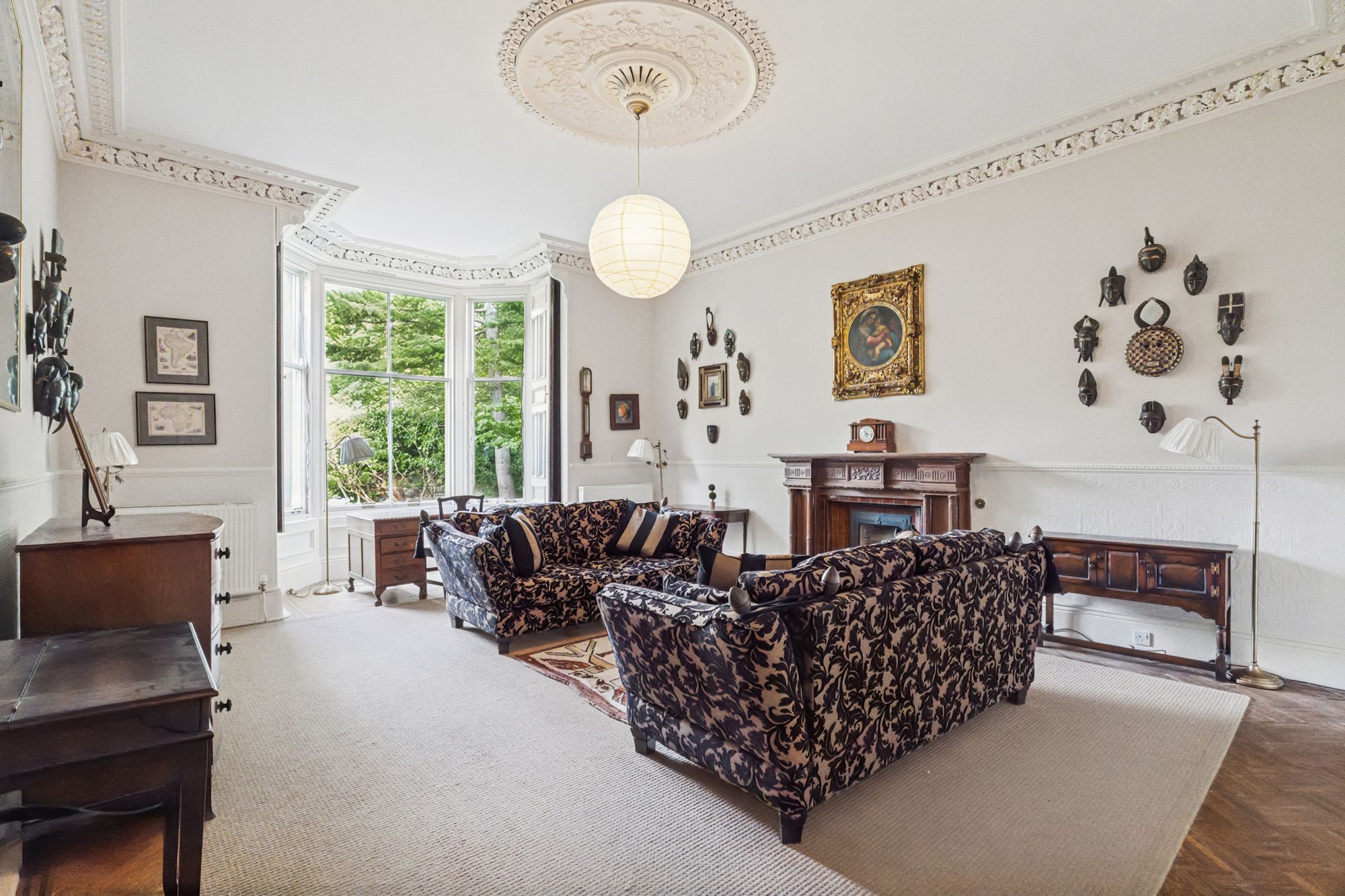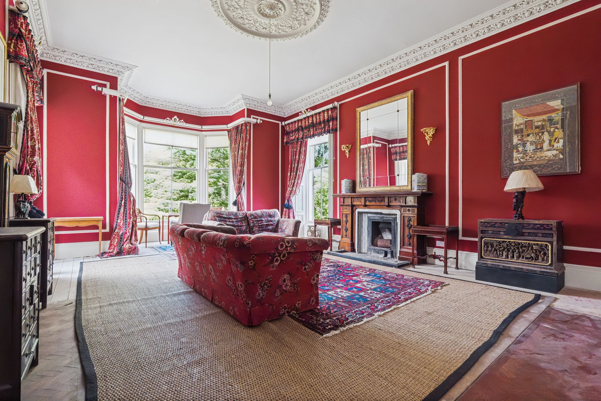 The grand stairs lead upwards and pass a magnificent stained-glass window emblazoned with this home's enduring moto 'Pro Rege et grege' - For King and flock. The stained glass also features the monogram of its builders and first family, R&R Patterson. This is a house with lineage. A spacious and useful landing leads to a drawing room with full height windows leading out to a small balcony over the front entrance. This grand room features the finest fireplace in the property. There are 3 large double bedrooms on this level, family bathroom and storage space.