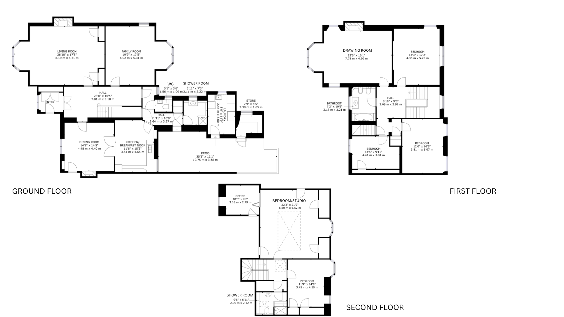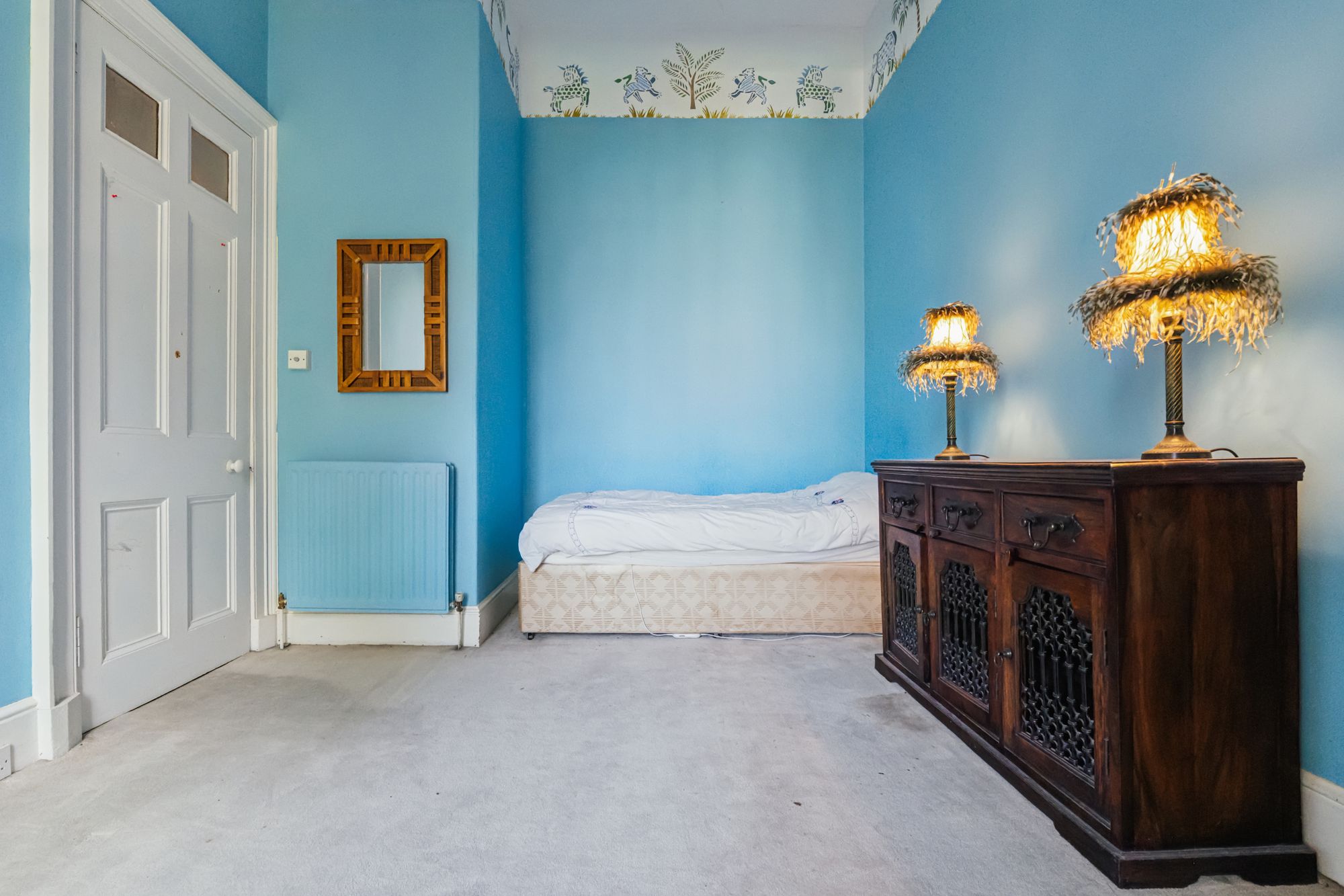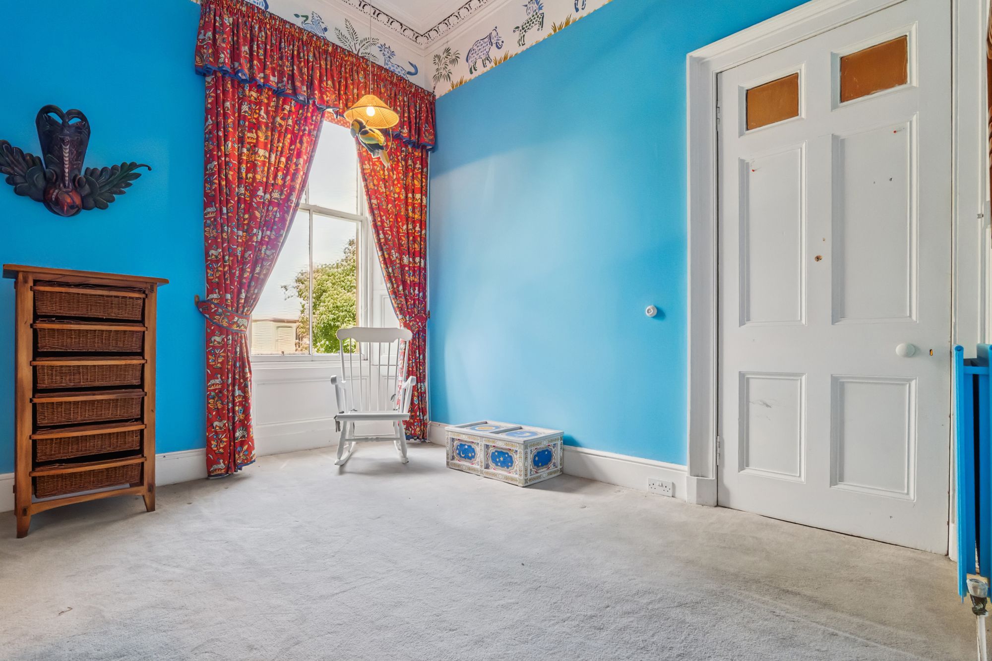The grand stairs lead upwards and pass a magnificent stained-glass window emblazoned with this home's enduring moto 'Pro Rege et grege' - For King and flock. The stained glass also features the monogram of its builders and first family, R&R Patterson. This is a house with lineage. A spacious and useful landing leads to a drawing room with full height windows leading out to a small balcony over the front entrance. This grand room features the finest fireplace in the property. There are 3 large double bedrooms on this level, family bathroom and storage space.