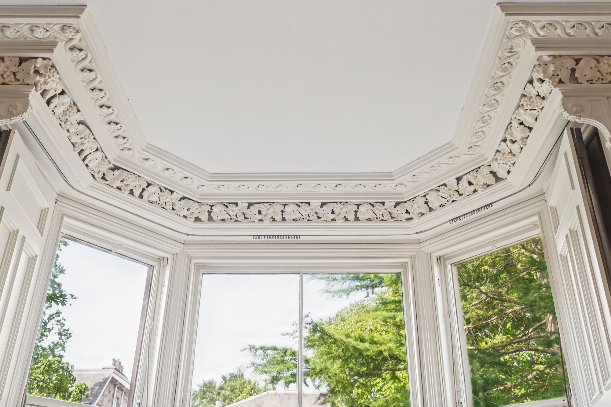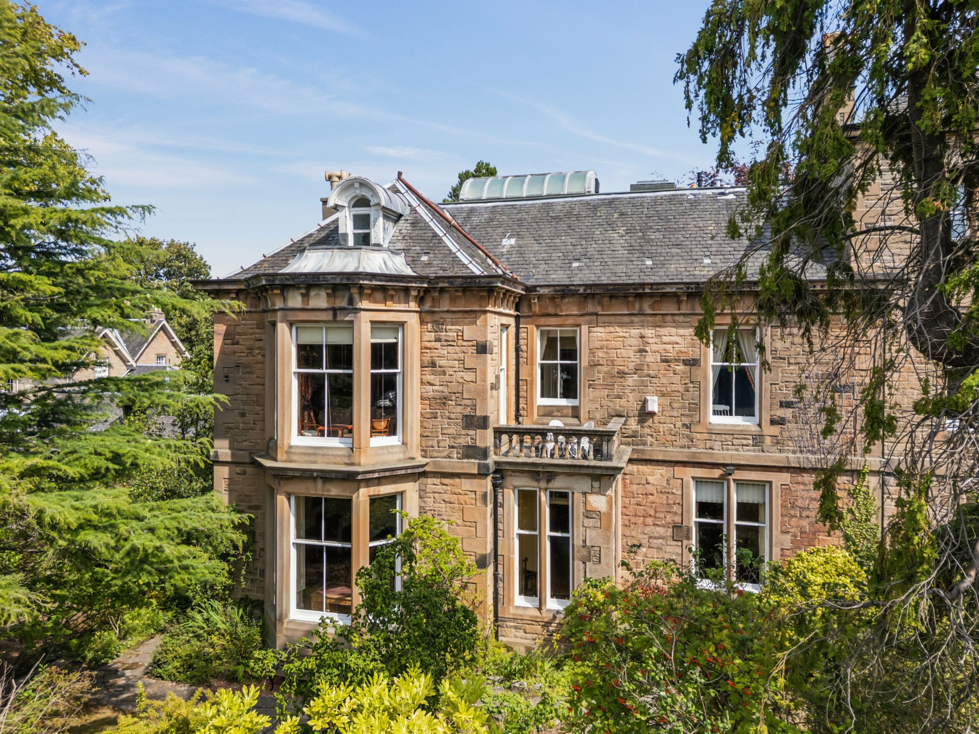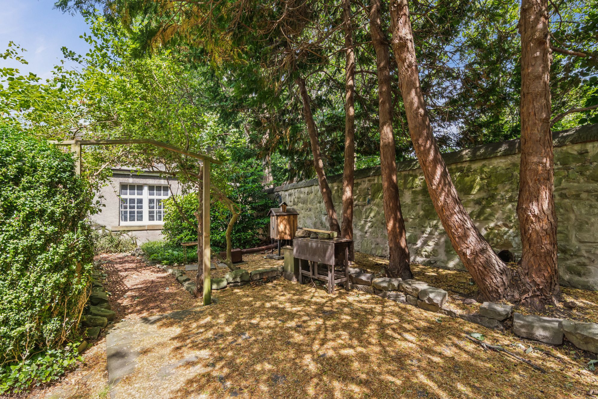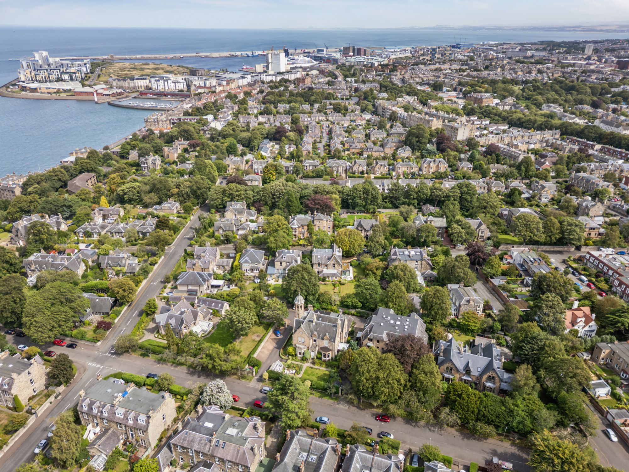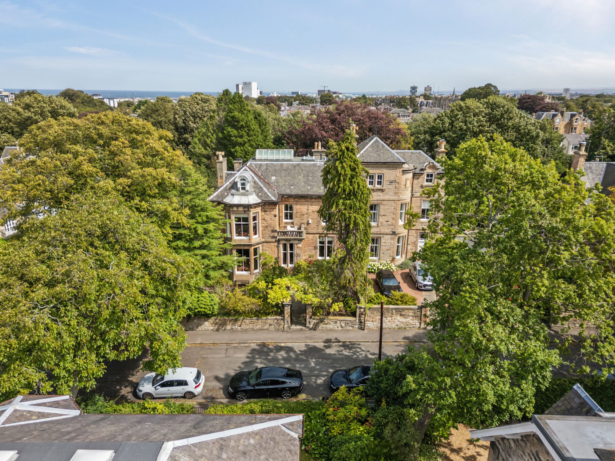 With an extended private driveway, the house is set far back from the quiet street in the very heart of Trinity. It is surrounded by magnificent mature trees, including beech, black walnut, cedar, apple and Scots pine and has a large and private walled garden and a gated entrance to the front.
