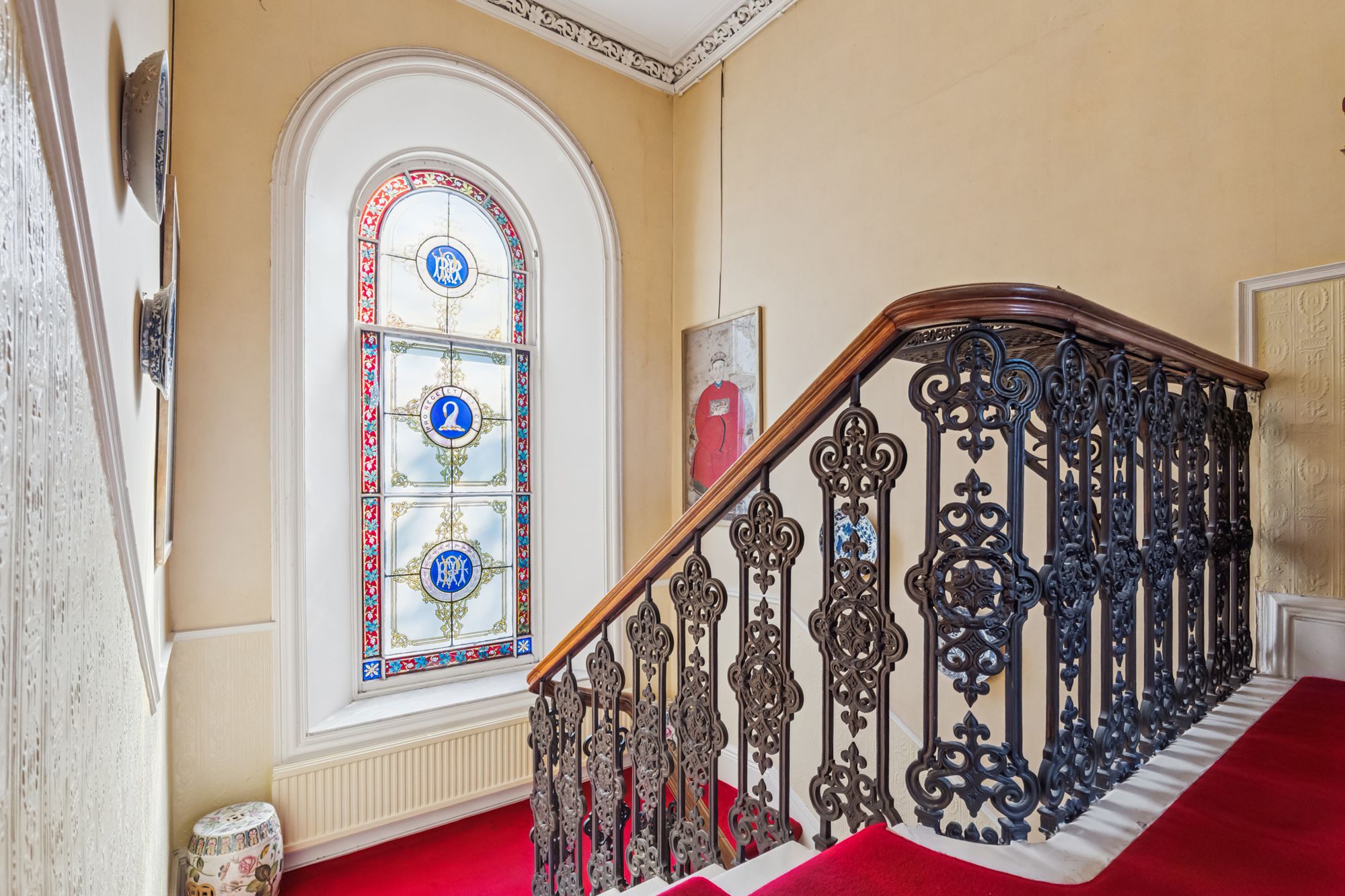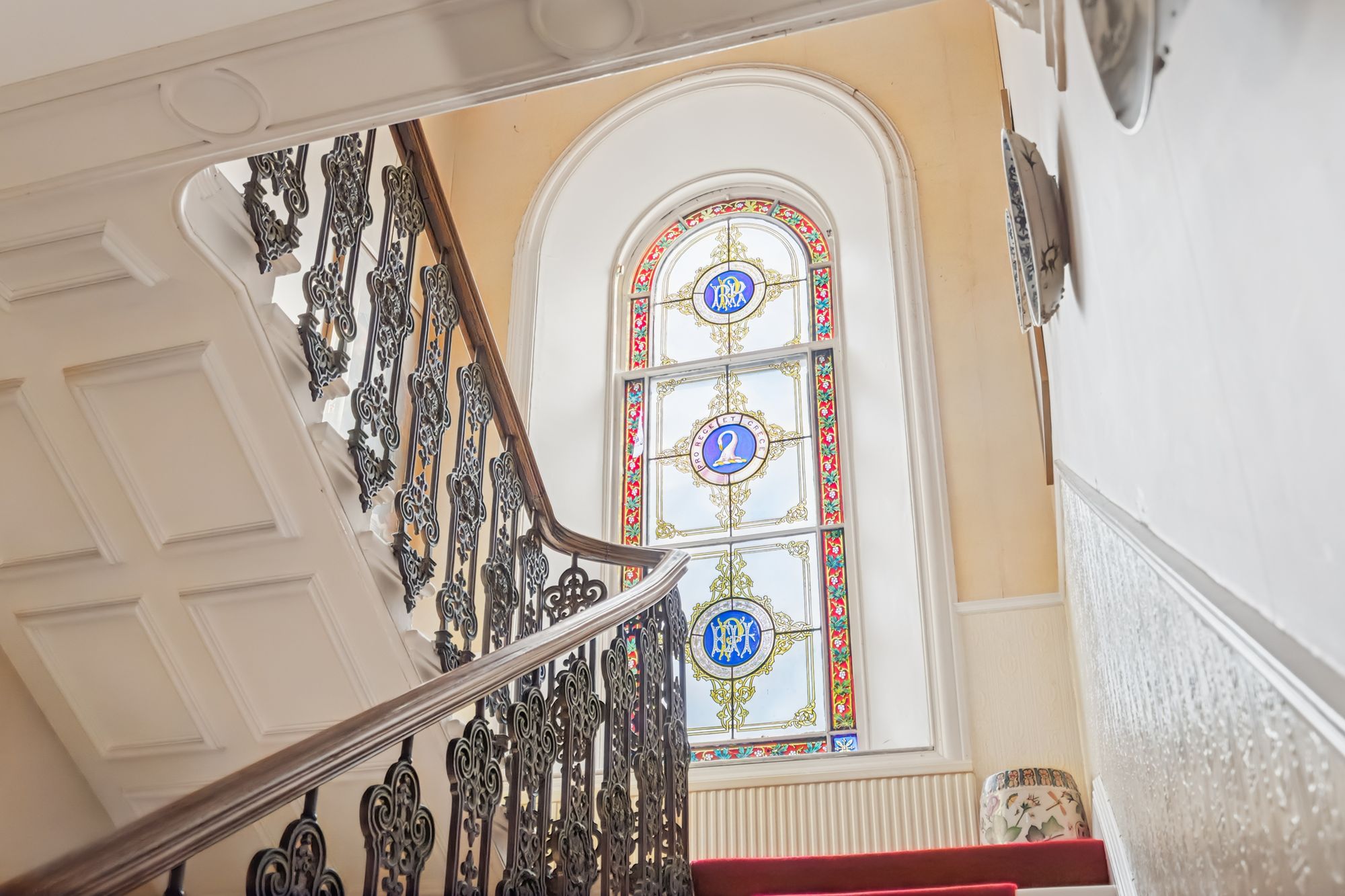 - Magnificent stained-glass window emblazoned with this home's enduring moto 'Pro Rege et grege' - For King and flock
