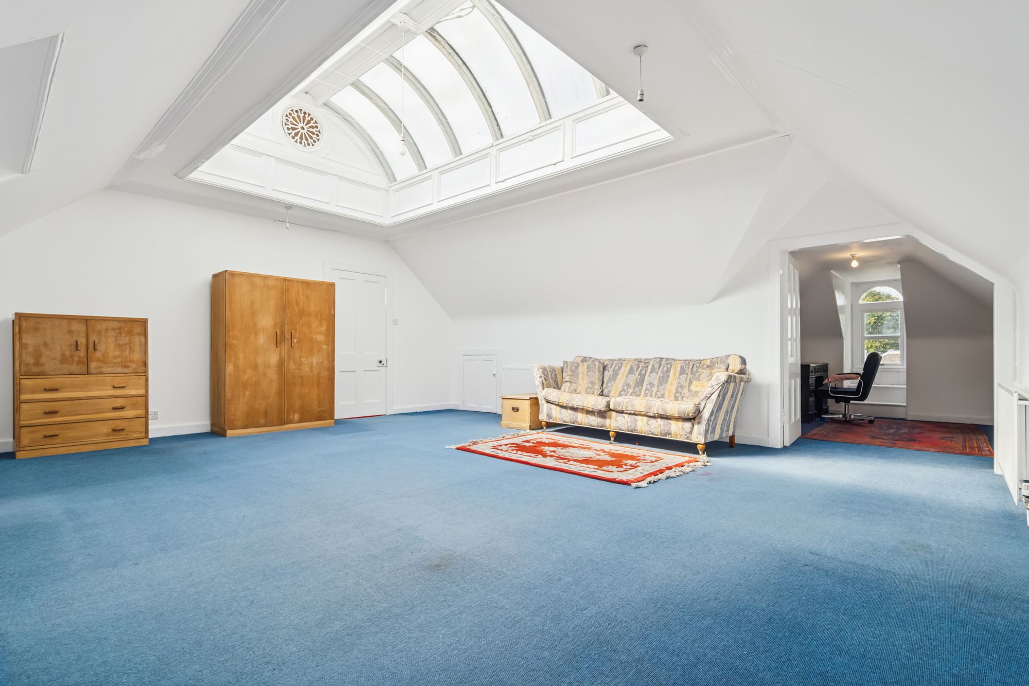 A further internal staircase brings you up to the upper level that features a hugely impressive open space with large skylight, likely the original Victorian nursery. It now provides an excellent, versatile opportunity to use as a bedroom, or a more creative space such as artist studio or exceptional home office space. It boasts an additional room off to the side (likely once for the nanny), as well as ample storage within the eves. This top floor also features additional double bedroom and separate shower room.