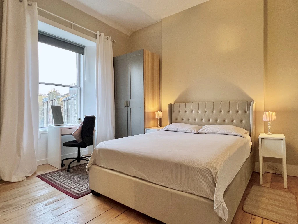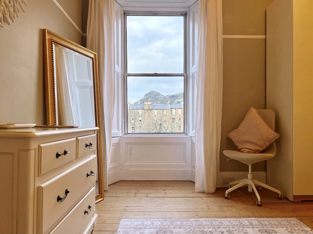 The light airy accommodation is situated to the rear of the building, giving a quieter environment for the fantastic central location. The property comprises of large open plan living room and kitchen, with ample space for dining and a wonderful outlook to Arthurs Seat.